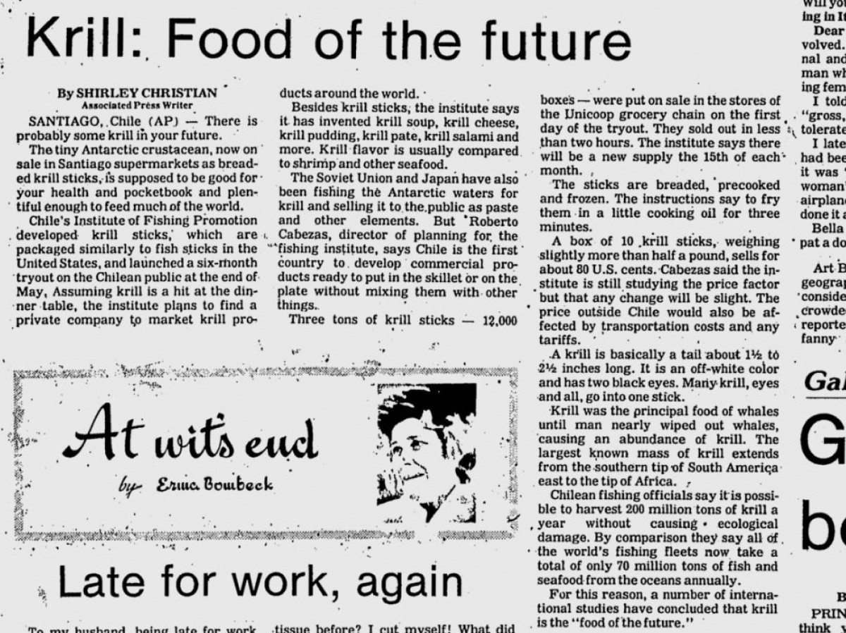 When the Baleen whale population is almost wiped-out in the 1960s, scientists argue that their extinction will result in a global surplus of krill and the remarkable assumption is made that it will be possible to harvest around 200 million tons of krill without causing ecological damage (at this time, the annual global catch of seafood is 70 million tons). To stimulate consumption of krill, the fishing industry promotes the product as the ‘food of the future’, capable of ending world hunger. In 1977, Chile’s Institute of Fishing Promotion develops krill sticks as a replacement for fish sticks, along with krill soup, krill cheese, krill pudding, krill pâté and krill salami.