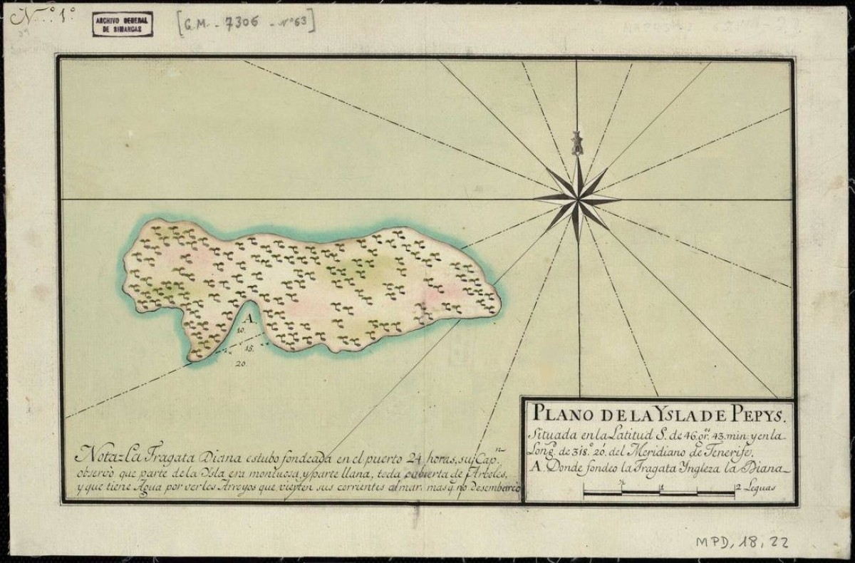 In 1765, the British found a settlement named Port Egmont on Saunders Island in the Falklands unawares of Port Louis, the recently established French settlement on the other side of the archipelago. This accident becomes the basis of territorial disputes over the Falklands, which remain unresolved to this day.In 1765, Commodore Lord Byron, grandfather of the eponymous famous poet, sets out for Pepys Island with his ship, the HMS Dolphin, and the frigate Tamar. Locating the Island remains important for the honour of Samuel Pepys even though there are many doubts about the island’s very existence. Because the trip would potentially create tensions with Spain, Commodore Byron and the Earl of Egmont, First Lord of the Admiralty, keep their intended destination a secret, pretending to sail to the East Indies. For a large part of the journey, even the crew does not know their true destination. Byron eventually sails on to the Falkland Islands after he is unable to locate the phantom island. Recognizing the strategic location of the Falklands, Byron claims the territory under the authority of King George III and sends a message back home with the news. He founds the first settlement on Saunders Island and prepares vegetable gardens awaiting the first settlers. Byron calls it the finest natural harbour in the world, with good soil and protection from wind. Within a year, under leadership of captain John McBride, the population of this settlement, now called Port Egmont, grows to approximately 100. Sheep and goats are imported and wharfs, huts, gardens, storehouses, a fort and a residence house are built. One ship is always present to protect the settlers, while other ships scan the coasts of Patagonia for Pepys Island. After a year, the English discover a bottle with a French note in it and realize that on the other side of the archipelago another settlement has been built.